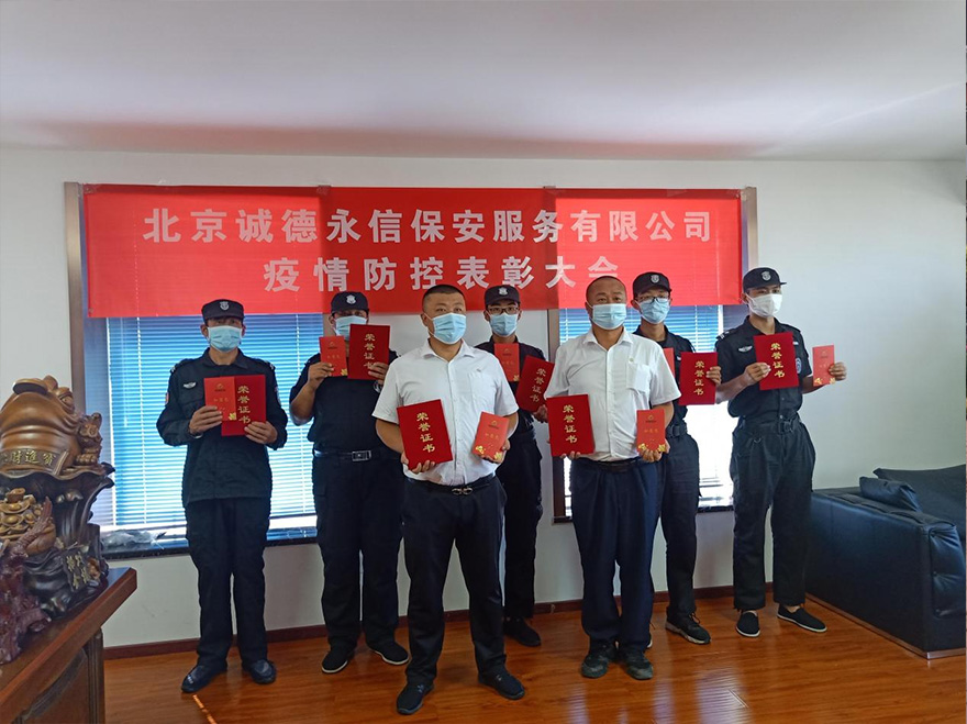 此次表彰大会,是我司对房山区阎村镇千禧家园抗疫工作的总结,同时表彰在抗疫期间的优秀员工并颁发证书和奖金。获奖人员分别为:郭宏宇、于龙、王立刚、李利景、时立辉、陈子阳及吴文平7位保安同志。受表彰的保安队长说:“作为社区防疫服务队员,面对疫情,责无旁贷,我是一名退伍军人,更应该挺在前面!”